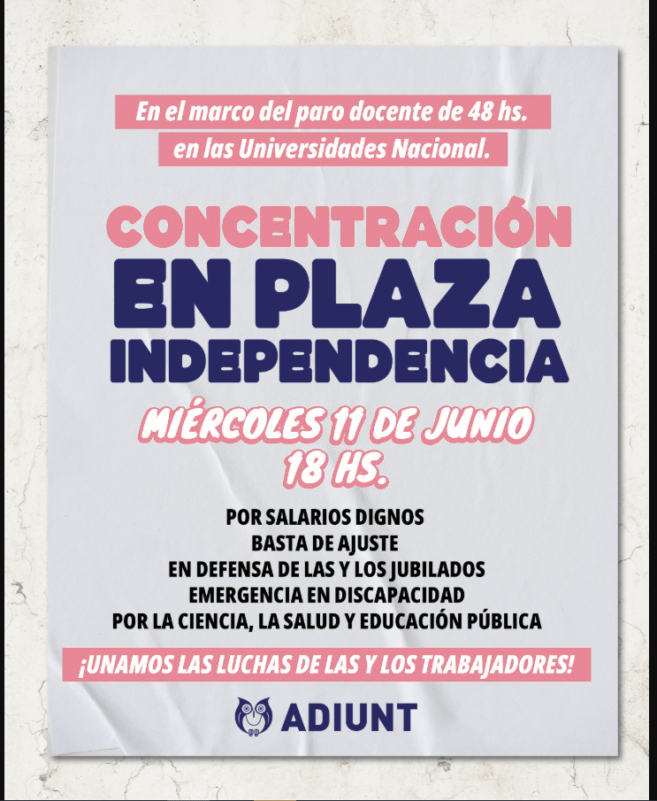 La Asociación de Docentes e Investigadores de la Universidad Nacional de Tucumán (ADIUNT) adhiere y convoca al Paro Nacional de 48 horas los días miércoles 11 y jueves 12 de junio, en el marco de la medida de fuerza resuelta por el Plenario de Secretarías Generales de CONADU Histórica.