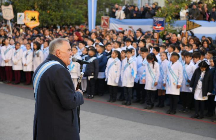El gobernador, en su discurso, expresó su agradecimiento a las instituciones educativas presentes: “son más de 60 escuelas que se han esforzado para que hoy juntos podamos rendir homenaje a nuestra bandera y a su creador Manuel Belgrano. Muchas gracias a cada uno de los docentes que acompañaron a los niños presentes”.