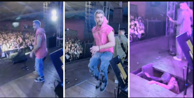 En pleno tema, al ejecutar un par de saltos, parte del escenario cedió y Ortiz cayó al vacío, golpeándose la...