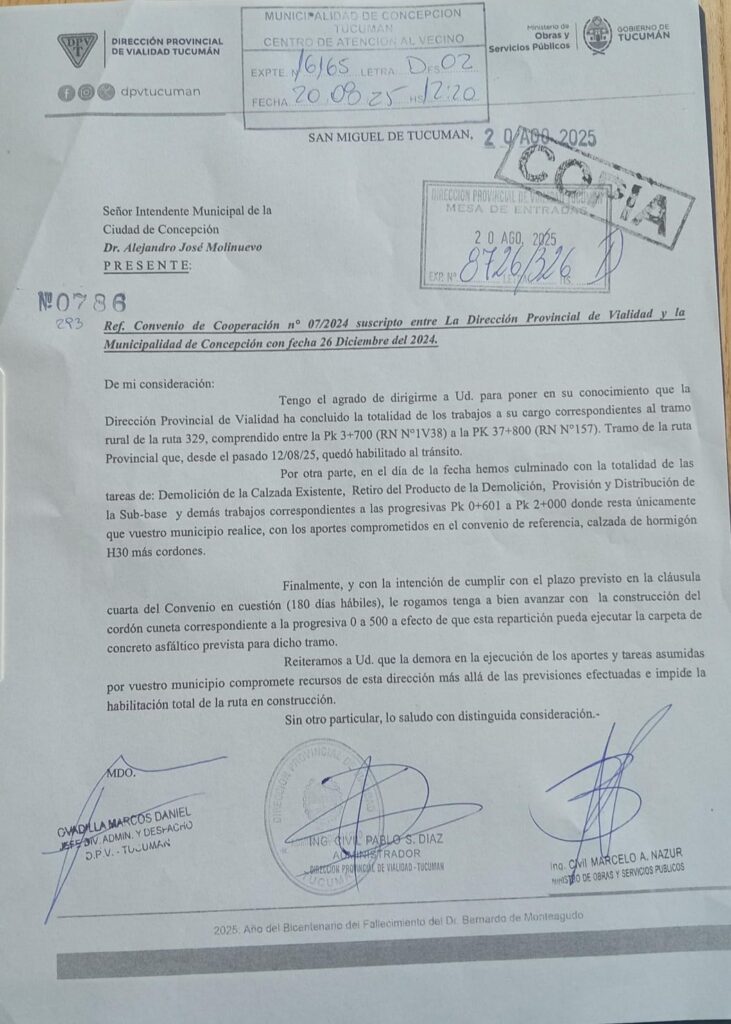 Por medio de una nota formal presentada ante la Municipalidad de Concepción, el Ministerio de Obras y Servicios Públicos de Tucumán y la Dirección Provincial de Vialidad (DPV) peticionaron al Ejecutivo de la ciudad del sur provincial que cumpla con su parte del convenio de cooperación y avance con la obra en la ruta 329 para poder terminar la carpeta asfáltica en tiempo y forma. En el escrito, el organismo provincial solicita a la municipalidad concepcionense que concluya las tareas de cordón cuneta para poder continuar con los trabajos.