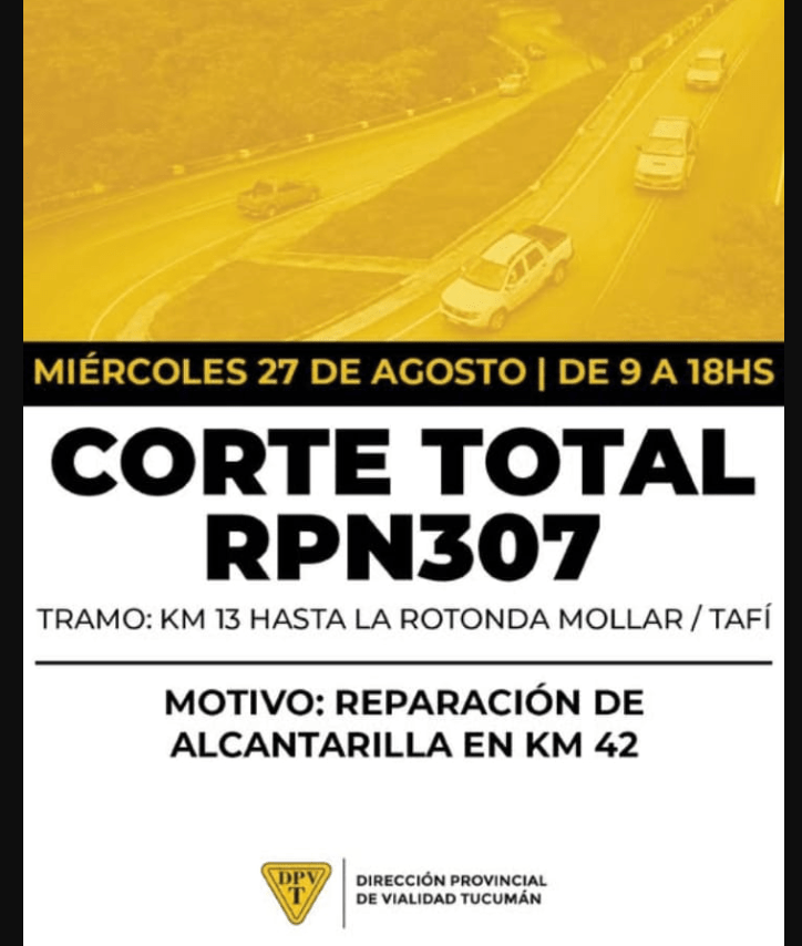La Dirección Provincial de Vialidad de Tucumán informó que este miércoles 27 de agosto la Ruta Provincial N° 307 permanecerá cortada.