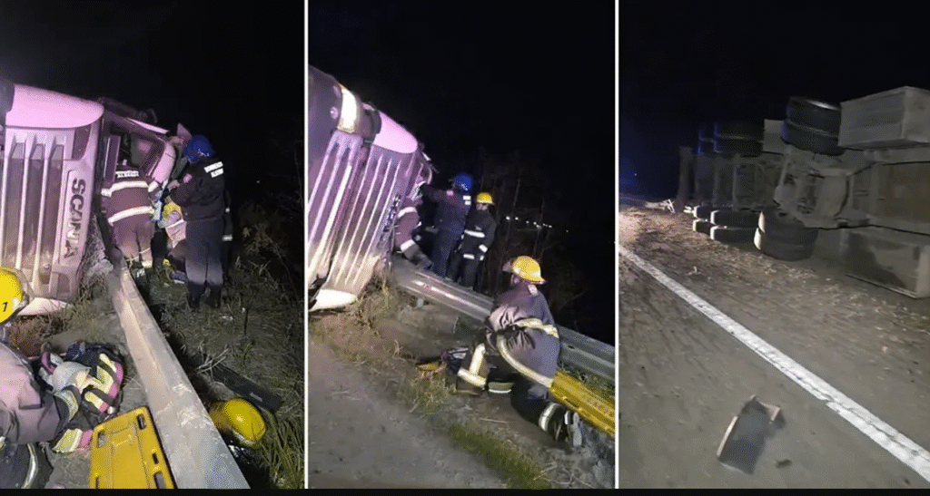 Por causas que aún se investigan, el vehículo que circulaba de norte a sur perdió el control y volcó hacia la banquina sur, quedando el camionero atrapado en la cabina