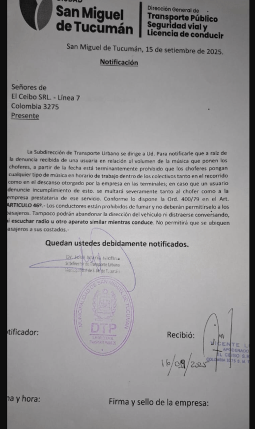 La Municipalidad de San Miguel de Tucumán implementó una medida que generó debate entre empresarios del transporte y usuarios: en la capital queda terminantemente prohibido que los choferes reproduzcan música en los colectivos durante el horario de trabajo. La notificación, emitida por la Secretaría de Movilidad Urbana, se basa en la ordenanza vigente que regula este tipo de infracciones.
