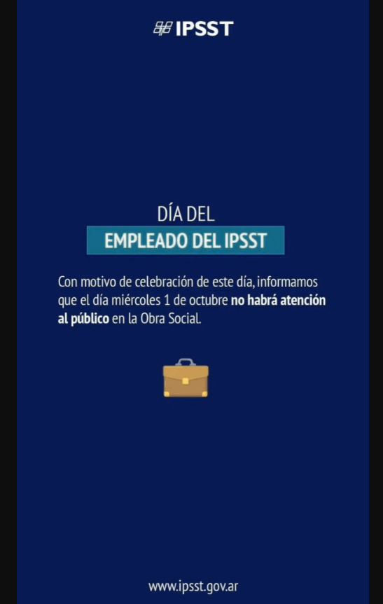Este miércoles 1 de octubre se conmemora el Día del Empleado del Instituto de Previsión y Seguridad Social de Tucumán, y por este motivo, no habrá atención al público. Todas las filiales de la obra social estatal permanecerán cerradas.