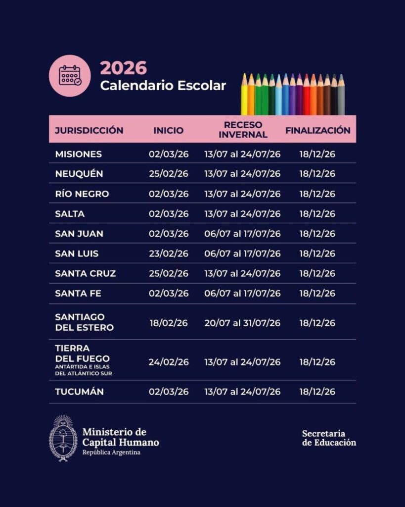 A través de la Secretaría de Educación, el Ministerio de Capital Humano oficializó el calendario escolar para el ciclo lectivo 2026 en toda la Argentina