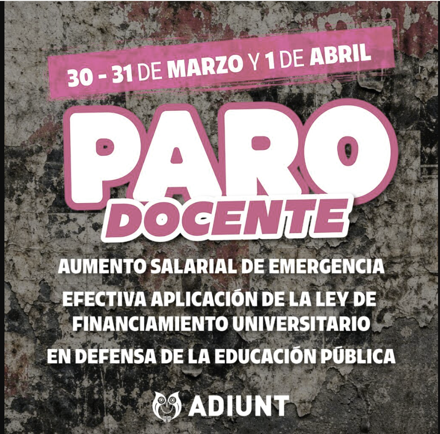 La ADIUNT informa la continuidad del plan de lucha con una nueva semana de Paro Nacional Universitario a partir del lunes 30 de marzo, ante la persistente pérdida del poder adquisitivo de los salarios docentes y el desfinanciamiento del sistema universitario público.
