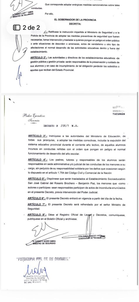 La normativa ratifica las instrucciones impartidas al Ministerio de Seguridad y a la Policía de Tucumán para adoptar todas las medidas necesarias que permitan prevenir hechos de violencia, intervenir ante situaciones de riesgo y garantizar la seguridad dentro y fuera de los establecimientos educativos.