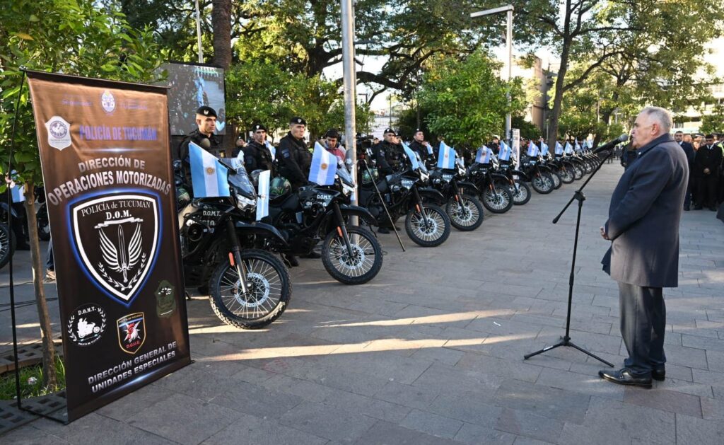 El gobernador Osvaldo Jaldo encabezó esta mañana en Plaza Independencia un acto de entrega de equipamiento vehicular e insumos tecnológicos destinados a la Policía de Tucumán. La incorporación incluyó motocicletas, bicicletas, camionetas e impresoras para distintas áreas operativas y administrativas de la fuerza.